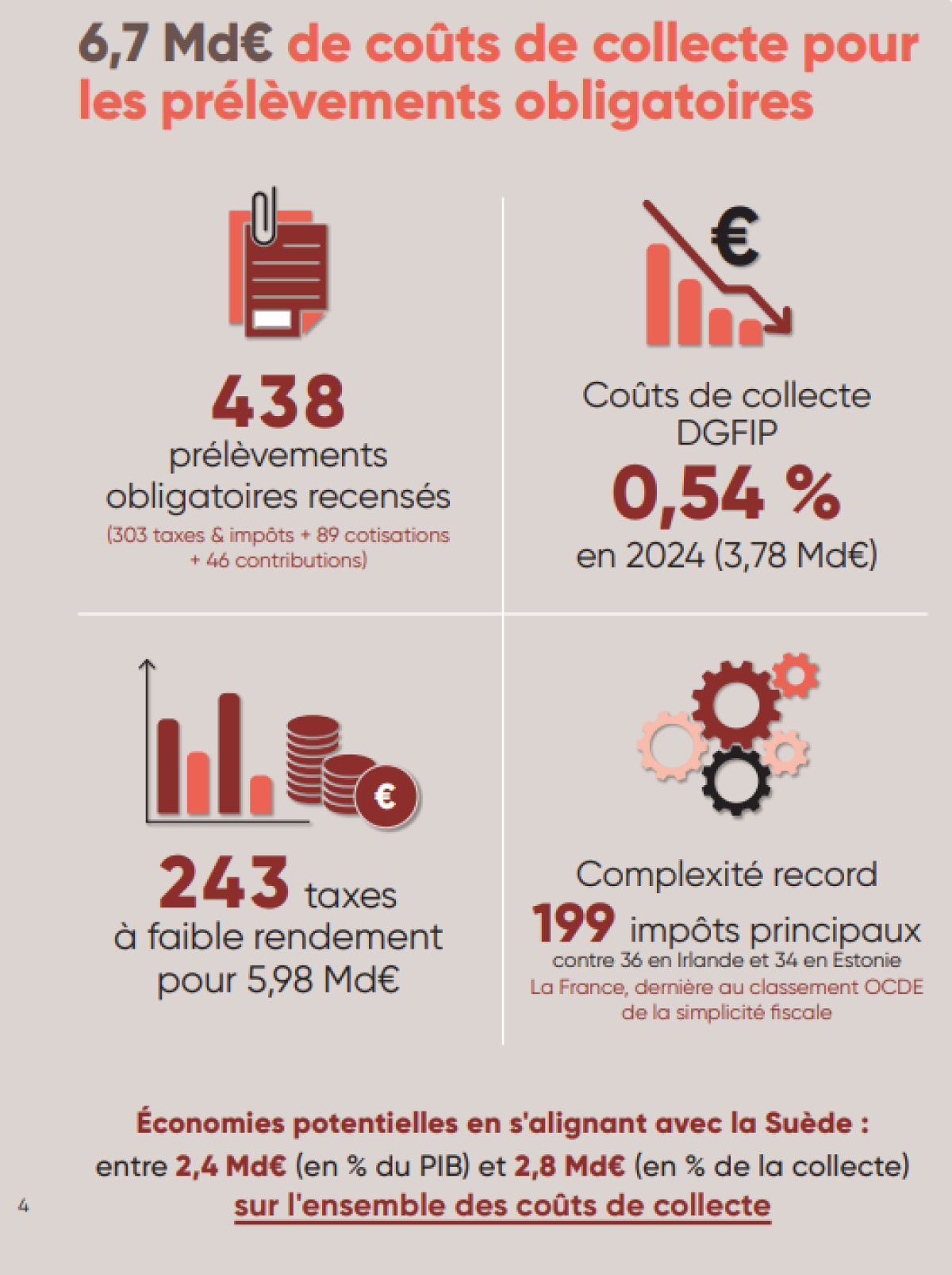En comparant le système fiscal français aux systèmes estonien et suédois avec le ratio coûts de collecte/PIB, l'écart est encore plus important. La France avait un ratio de 0,24 % du PIB en 2023, contre 0,15 % du PIB pour la Suède (hors douanes) et 0,09 % du PIB pour l'Estonie. Avec le ratio suédois, la DGFiP et l'URSSAF pourraient réduire leurs coûts de collecte de 1,4 Md €. Si le système fiscal français s'alignait sur le ratio estonien, les coûts de collecte seraient réduits de 4,3 Mds €, soit une baisse de 64 % !