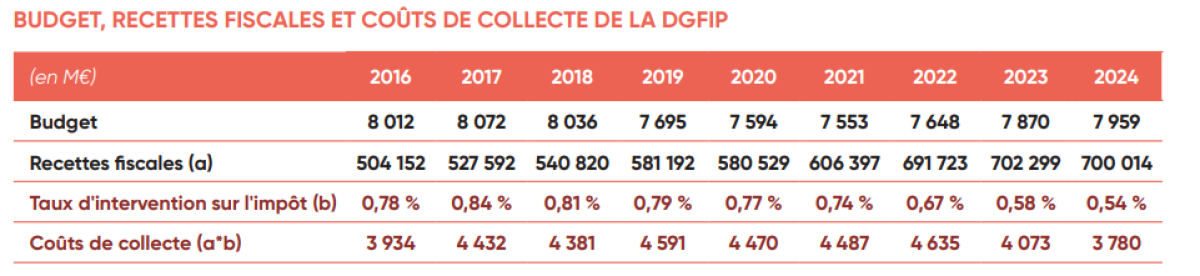 En 2024, la DGFiP (Direction Générale des Finances Publiques) enregistrait un taux d'intervention sur l'impôt de 0,54 %, contre 0,78 % en 2016. Le taux d'intervention sur l'impôt correspond au rapport des coûts de gestion de la collecte au montant des recettes fiscales brutes.