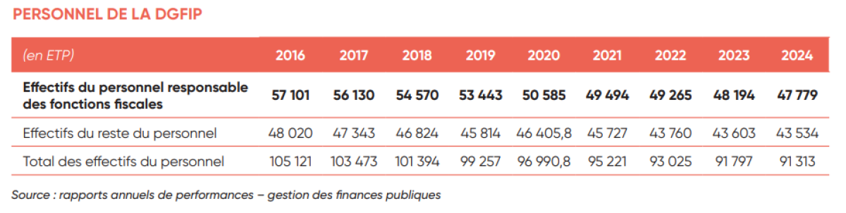 L'effort de réduction du personnel peut toutefois être souligné. Les effectifs des missions fiscales de la DGFiP sont passés de 57 101 ETP en 2016 à 47 779 ETP en 2024. Cette réduction des effectifs a permis de réaliser des économies sur les coûts de collecte et a donc participé à la baisse du taux d'intervention de la DGFiP.