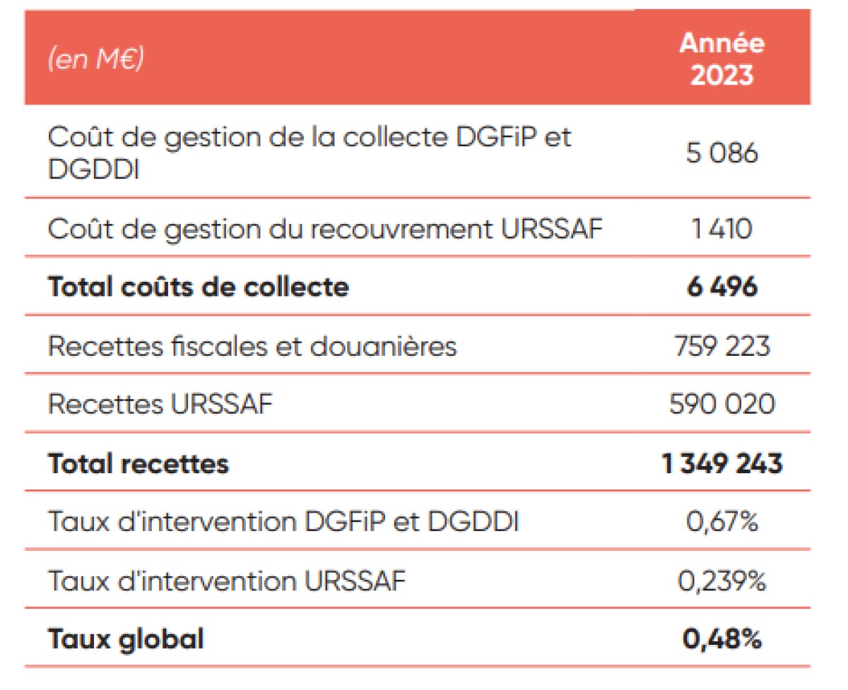 Cette complexité fiscale se répercute aussi dans les coûts de collecte : ils se situent à 0,54 % des impôts du périmètre DGFIP. Ce taux est supérieur si on inclue les Douanes (DGDDI) : 0,67 % mais inférieur si on prend aussi en compte les URSSAF, pour atteindre un taux global de 0,48 %, soit l'équivalent d'un coût global de collecte de 6,7 Md€.