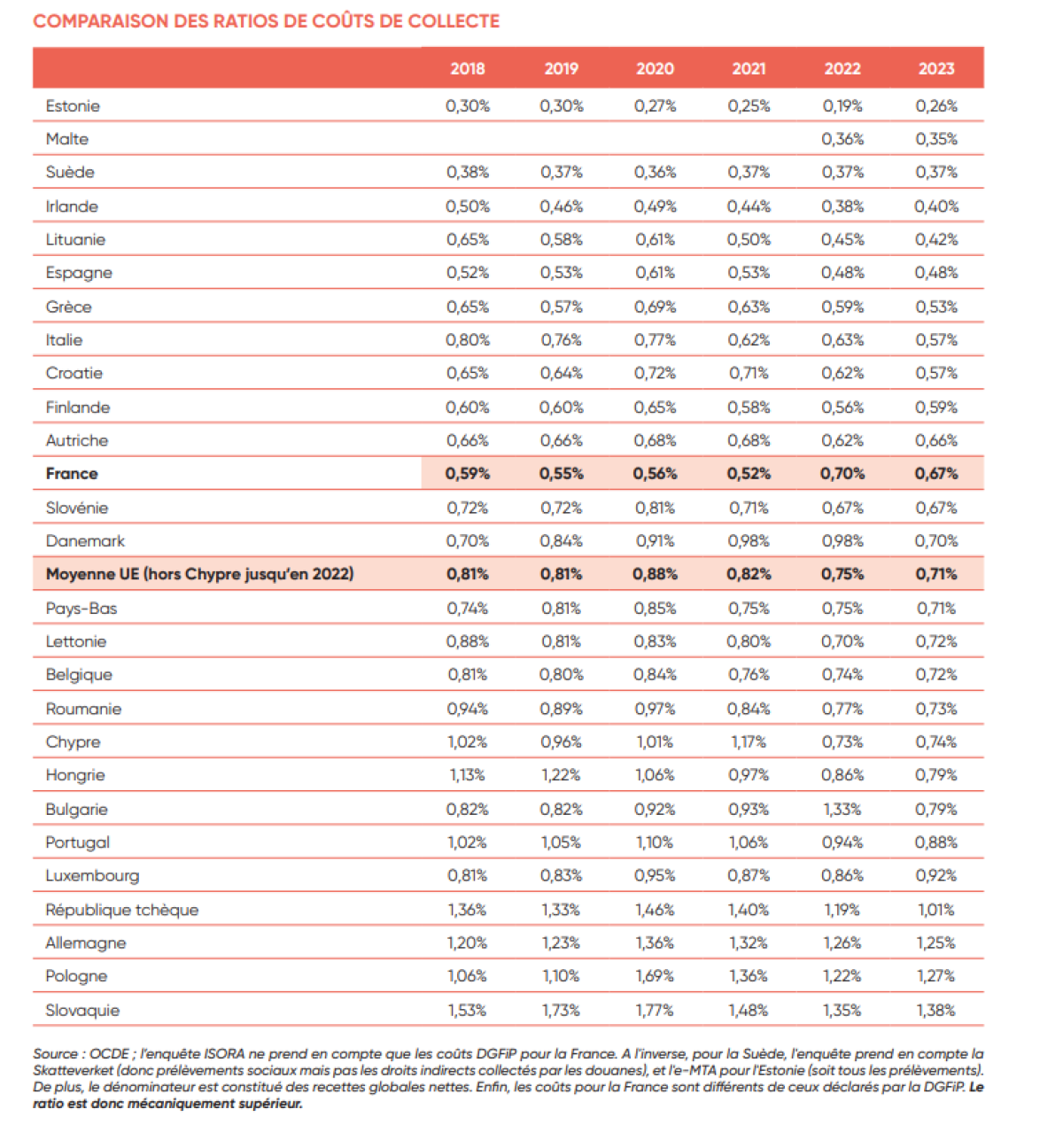 L'enquête ISORA (International Survey on Revenue Administration) permet de comparer les ratios de coûts de collecte dans différents pays. Si l'on se concentre sur les pays européens, la France (0,67 %) est légèrement sous la moyenne de l'UE (0,71 %).