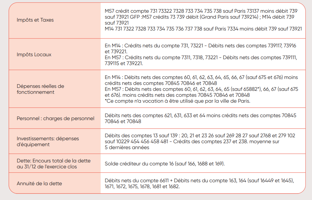 MéthodologieLes données comptables proviennent des exports globaux au format CSV des données du site data.economie.gouv.fr. Les données comptables intègrent les budgets suivants : budget principal ; budgets annexes et les groupements à fiscalité propre (GFP), à savoir les intercommunalités (EPCI) et les établissements publics territoriaux (EPT) qui font partie de la métropole du grand Paris. Source : https://data.economie.gouv.fr/explore/dataset/balances-comptables-des-communes-en-2024/information/ Les chiffres donnés sont tous les chiffres 2024 sauf pour l'investissement : moyenne sur la période 2020 à 2024. La population retenue est la population Insee. Les indicateurs sont les suivants :
