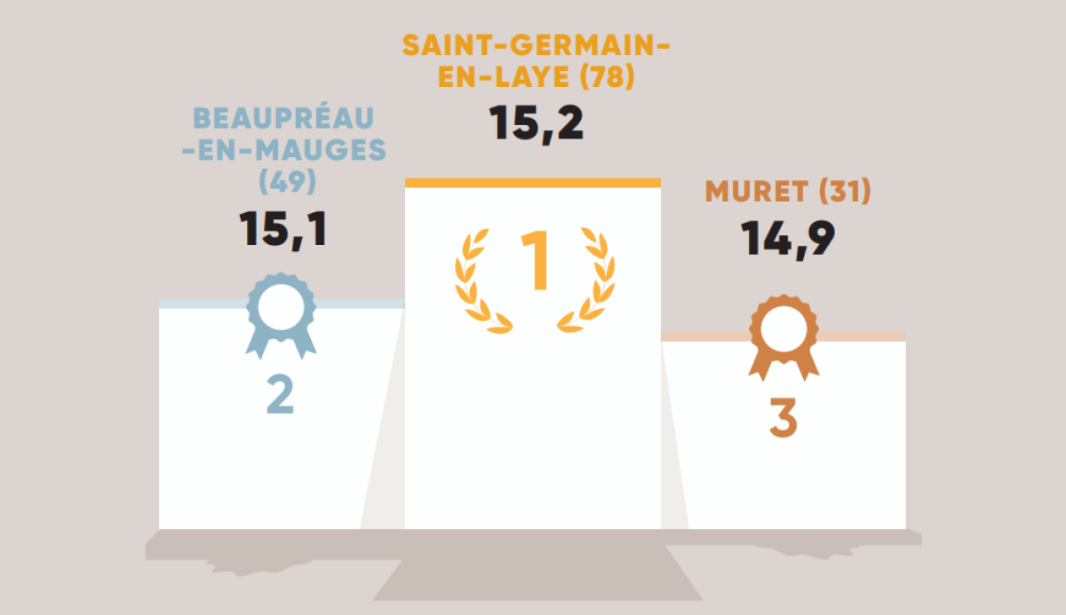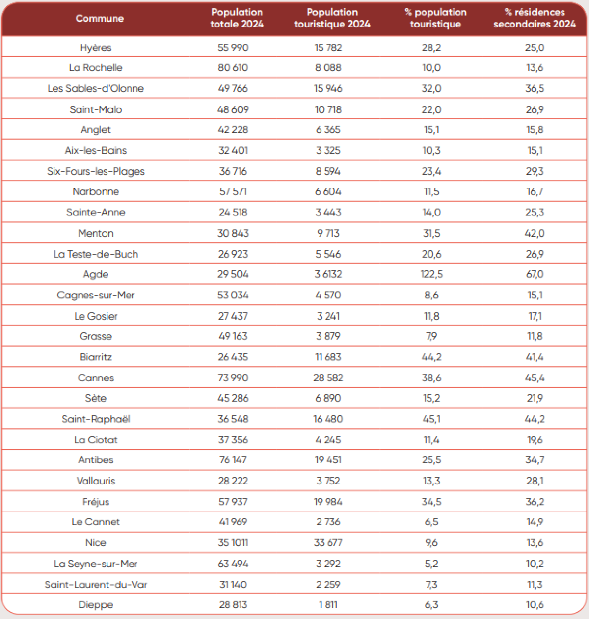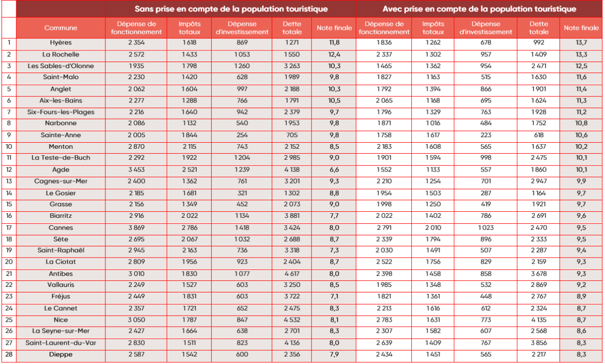 La Rochelle domine nettement (12,37), suivie par Hyères (11,81), Aix-les-Bains (10,50), Anglet (10,35) et Les Sables-d’Olonne (10,32). À l’opposé, Agde est lanterne rouge (6,57), devant Fréjus (7,06), Saint-Raphaël (7,32), Biarritz (7,65) et Dieppe (7,93). On observait une légère corrélation entre le pourcentage de population touristique et la note classique : plus une commune comptait de touristes/de résidences secondaires, plus ses ratios par habitant paraissent dégradés.