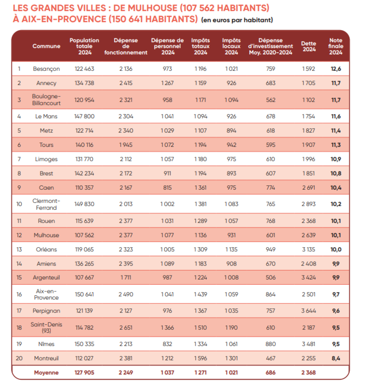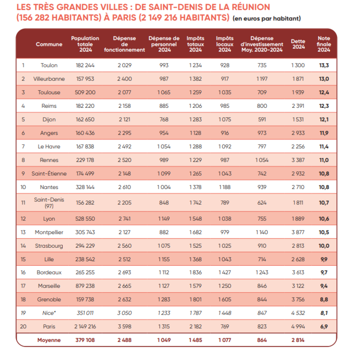 *Note : Nous avons tenu compte de l'impact de la population touristique sur la gestion financière des villes. Dans le cas de la ville de Nice, nous évaluons la population touristique à 9,6% de la population INSEE ce qui influence les indicateurs en €/habitant. Compte tenu de ces éléments, la note de Nice selon notre méthodologie s'établit à 8,7. La ville conserve la 19e place des très grandes villes.
