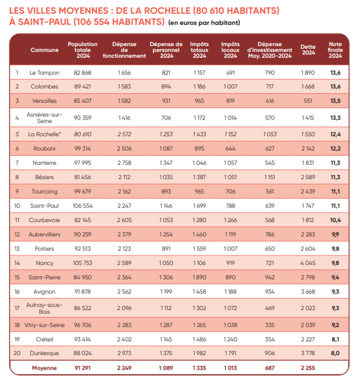 * Nous avons tenu compte de l'impact de la population touristique sur la gestion financière des villes. Dans le cas de la ville de La Rochelle, nous évaluons la population touristique à 10% de la population INSEE ce qui influence les indicateurs en €/habitant (voir les indicateurs recalculés pages 26-27). Compte tenu de ces éléments, la note de La Rochelle selon notre méthodologie s'établit à 13,3. La ville se situe à la 4e place ex aequo avec Asnières-sur-Seine des villes moyennes.