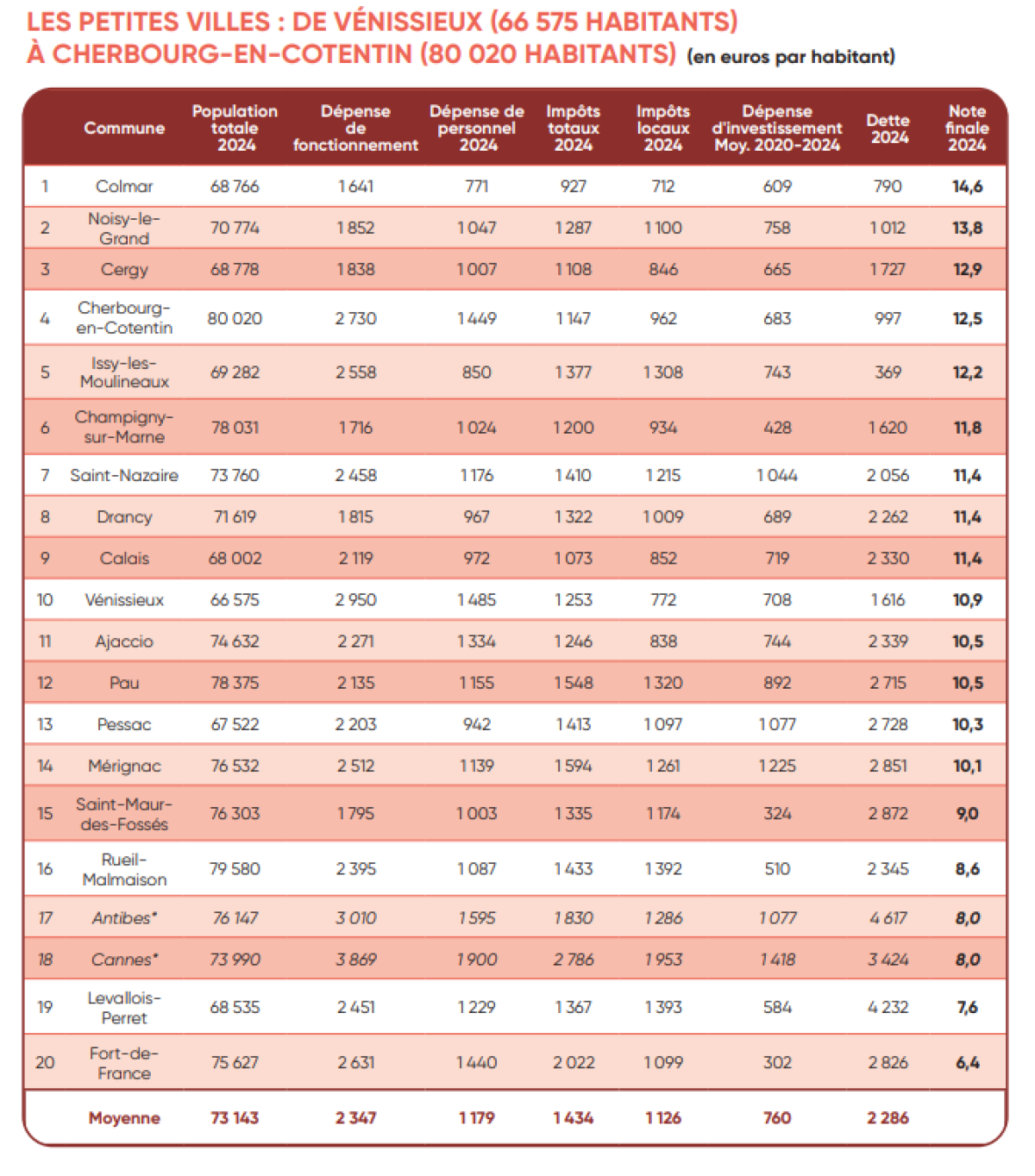 * Nous avons tenu compte de l'impact de la population touristique sur la gestion financière des villes. Dans le cas de la ville de Cannes, nous évaluons la population touristique à 38,6% de la population INSEE ce qui influence les indicateurs en €/habitant (voir les indicateurs recalculés pages 26-27). Compte tenu de ces éléments, la note de Cannes selon notre méthodologie s'établit à 9,5. La ville se situe à la 15e place des petites villes. Dans le cas de la ville d'Antibes, nous évaluons la population touristique à 25,5% de la population INSEE. Compte tenu de ces éléments, la note d'Antibes selon notre méthodologie s'établit à 9,3. La ville se situe à la 16e place de notre classement des petites villes.