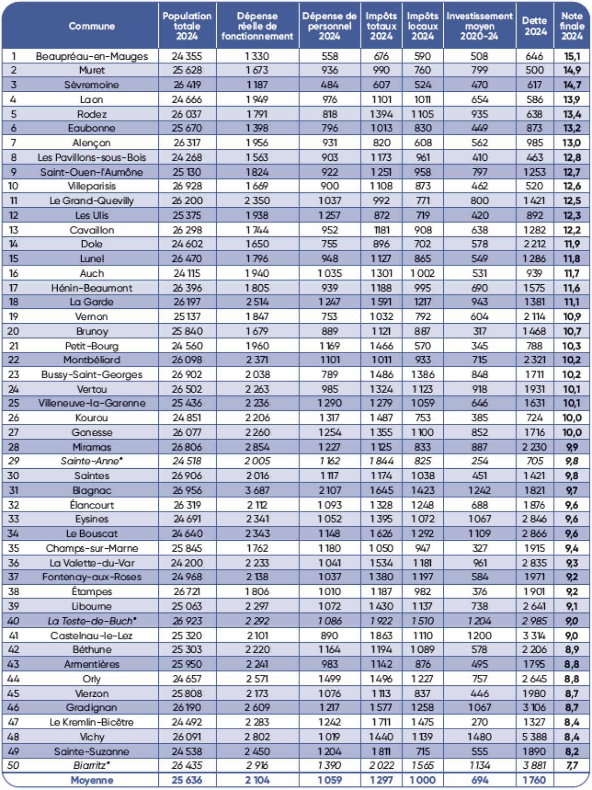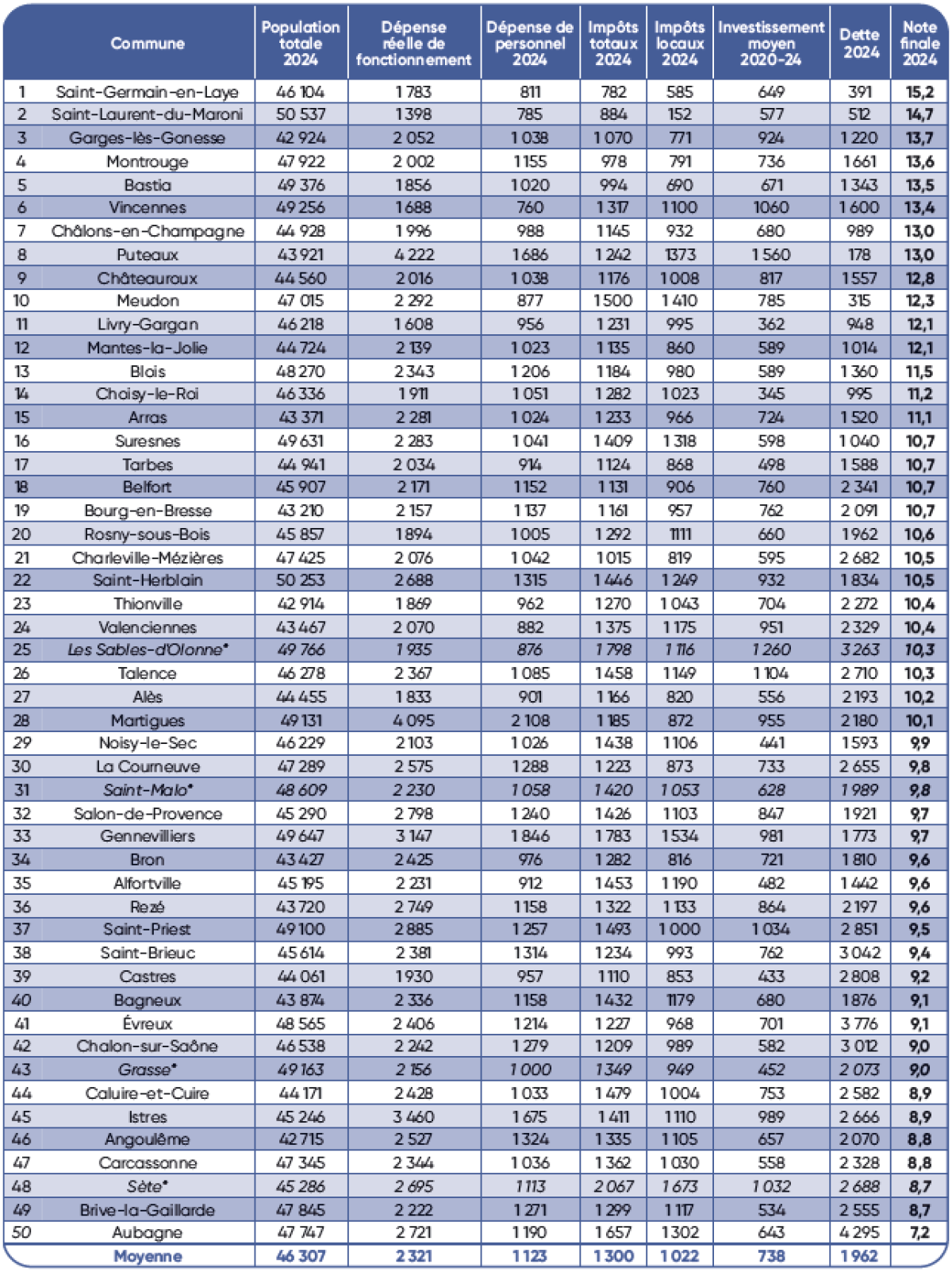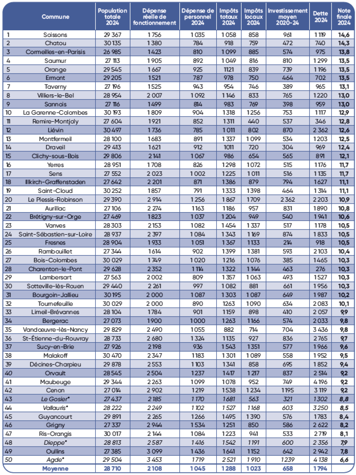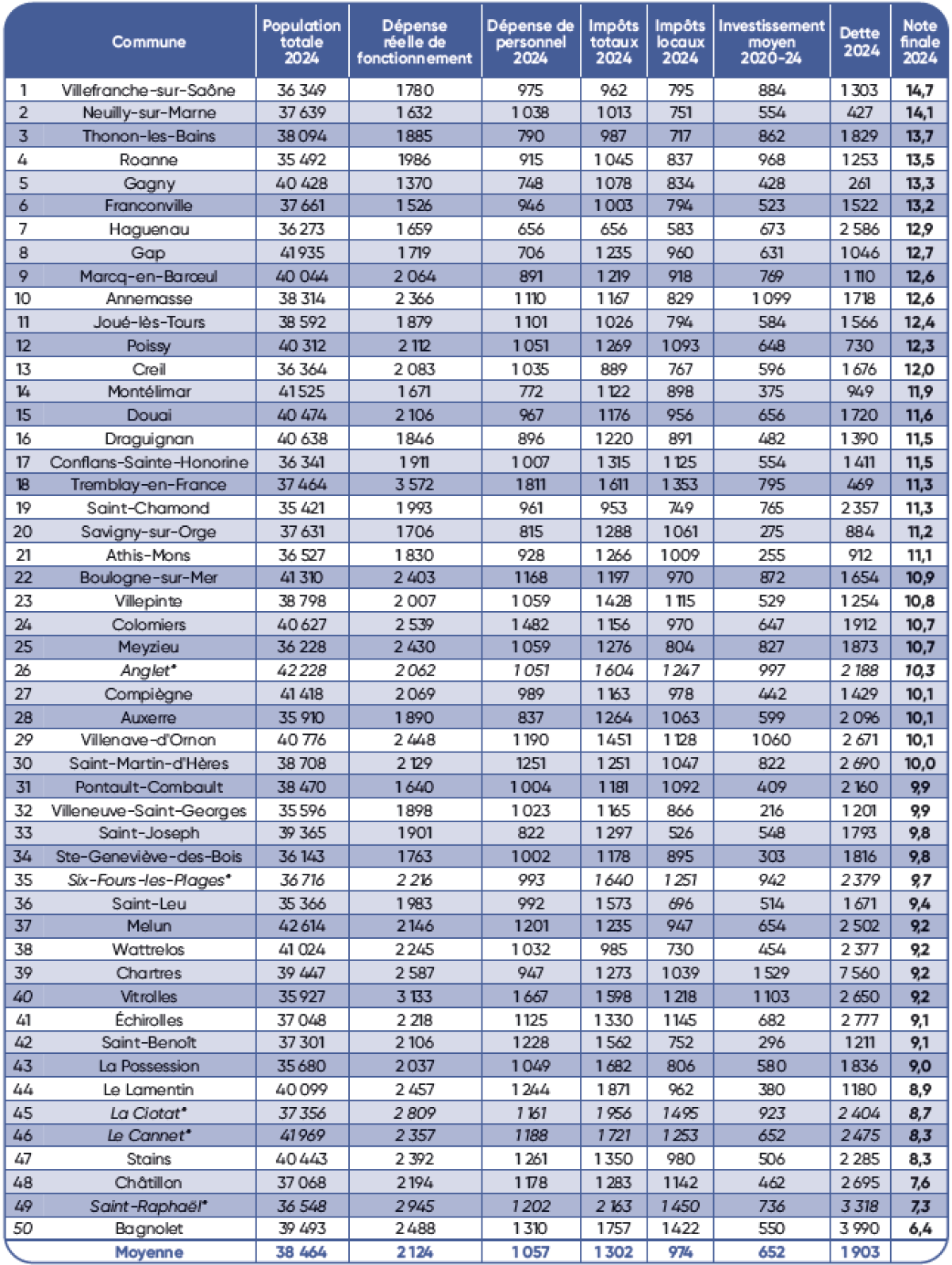 Les villes marquées d'une * sont des villes à forte population touristique. L'impact de la population touristique sur les indicateurs de gestion a été pris en compte dans les tableaux suivants et la note globale a été recalculée.