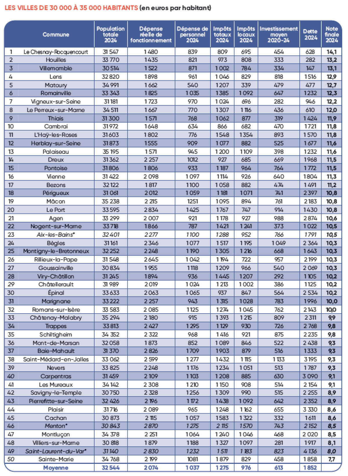 Pour la strate suivante (de 30 000 à 35 000 habitants), 4 villes affichent des dépenses réelles de fonctionnement au-dessus de 2 800 € par habitant : Le Port, Menton, Saint-Laurent-du Var et Baie-Mahault. À l’inverse deux villes sont autour de 1 400 € soit moitié moins : Houilles, Le Chesnay-Rocquencourt. C’est aussi à Baie Mahault et au Port que les dépenses de personnel sont les plus élevées : 1 709 € et 1 425 € par habitant. Elles se situent à 540 € Matoury et à 634 € à Cambrai. Sur la dette, la strate se situe dans les extrêmes : 147 € à Villemomble et 4 136 € à Saint-Laurent-du Var. Les impôts locaux varient de 339 € à Matoury à 1 570 € à Menton.