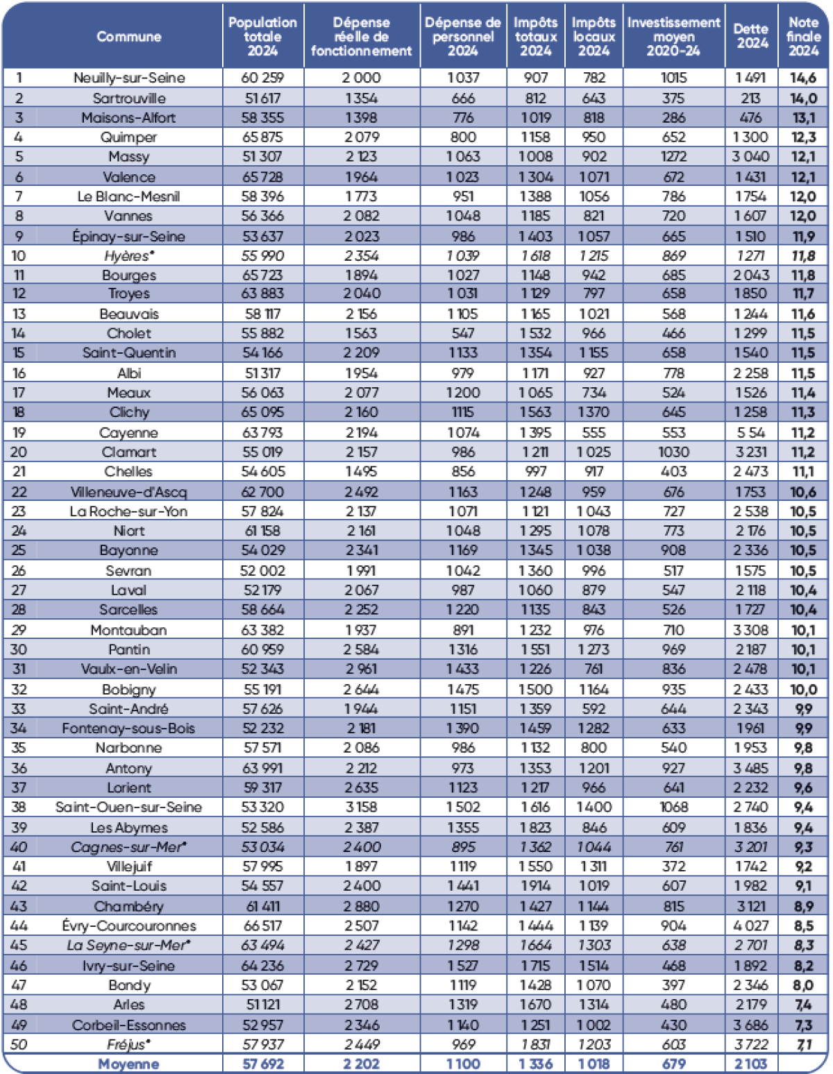 Les villes marquées d'une * sont des villes à forte population touristique. L'impact de la population touristique sur les indicateurs de gestion a été pris en compte dans les tableaux pages 26-27 et la note globale a été recalculée.