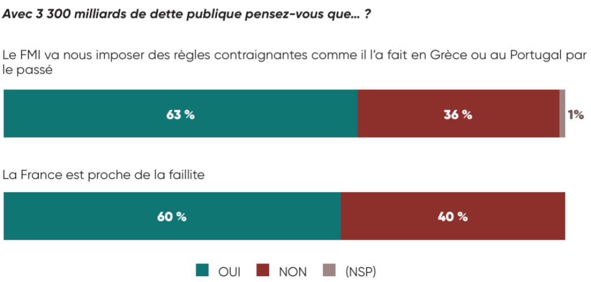 Il faut dire que plus de 6 Français sur 10 pensent que notre dette publique fait de la France « un pays proche de la faillite » (60%), qui va bientôt se voir imposer une mise sous tutelle du FMI comme la Grèce ou le Portugal il y a quelques années (63%).