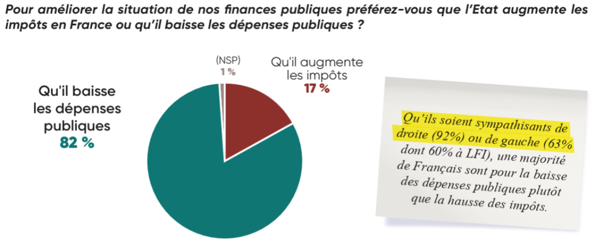 Dès lors, plus de 8 Français sur 10 (82%) souhaitent une baisse des dépenses publiques, plutôt que de voir augmenter leurs impôts.