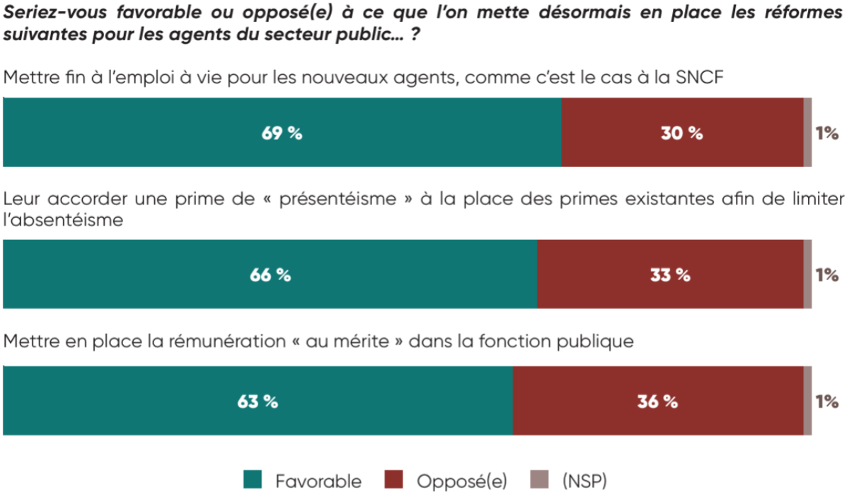 63 % sont favorables à la diminution du nombre de fonctionnaires en ne remplaçant pas une partie des départs à la retraite. Dans le détail, 69 % sont pour « la fin de l'emploi à vie pour les nouveaux agents » et 63 % soutiennent « la mise en place d'une rémunération au mérite ».