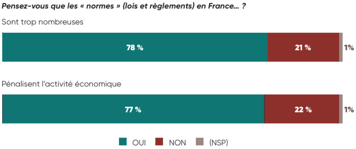 Plus des trois quarts des Français estiment aussi que les « normes » sont trop nombreuses dans notre pays (78%) et qu’elles« pénalisent l’activité économique » (77%) ; et autant (74%) veulent que l’on tranche dans le « mille-feuille » territorial, estimant « qu’il faudrait supprimer des collectivités territoriales car il y en a trop », selon eux.