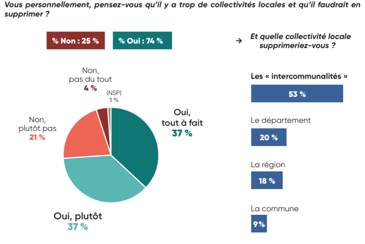 Plus des trois quarts estiment aussi que les « normes » sont trop nombreuses dans notre pays (78%) et qu’elles « pénalisent l’activité économique » (77%) et veulent « que l’on supprime des collectivités territoriales car il y en a trop » (74%).