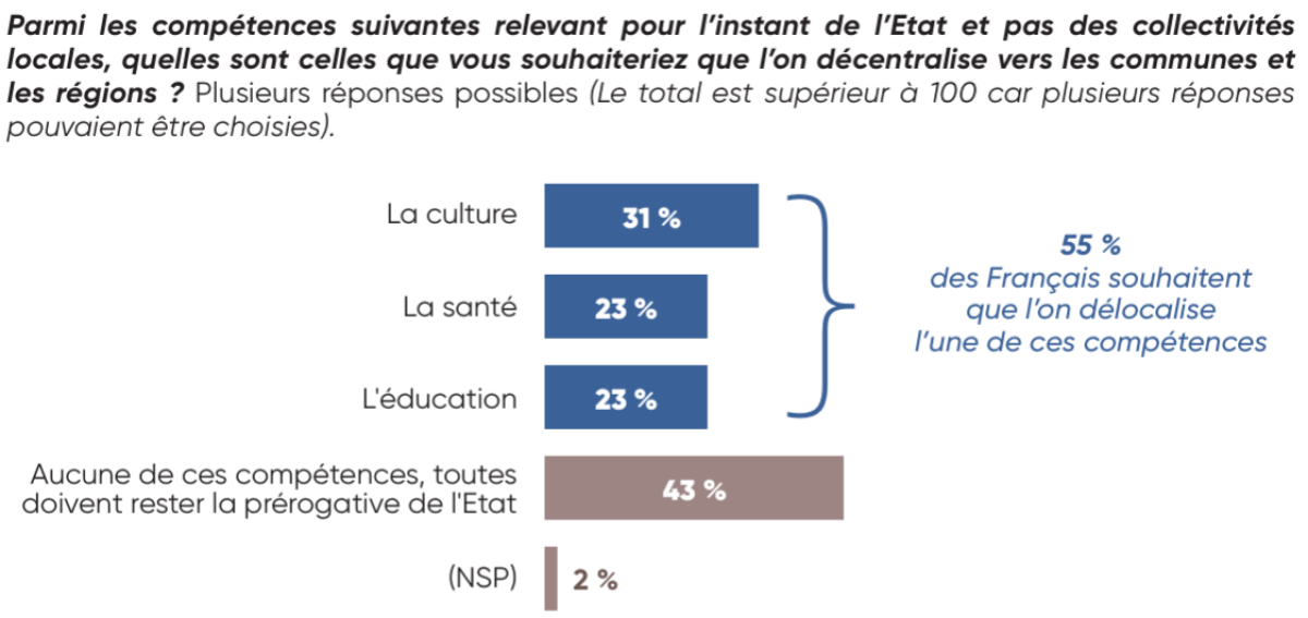 Enfin, les Français sont prêts à ce que l’on décentralise certaines compétences, comme la culture, la santé ou même l’éducation, et souhaitent les transférer aux collectivités locales. Si nul ne souhaite majoritairement que ces trois compétences soient toutes délocalisées, 55% des Français se disent favorables à ce qu’au moins l’une d’elles le soit.