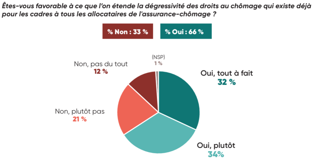66 % des Français seraient favorables à une extension de la dégressivité des droits au chômage en étendant cette mesure à tous les allocataires de l'assurance-chômage.