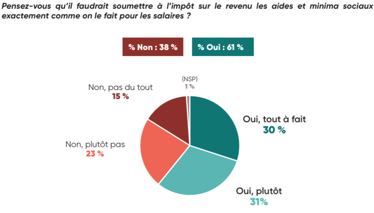 Autre signal fort : 61% des Français pensent qu’il faudrait soumettre les minima sociaux à l’impôt sur le revenu, exactement comme on le fait pour les salaires.