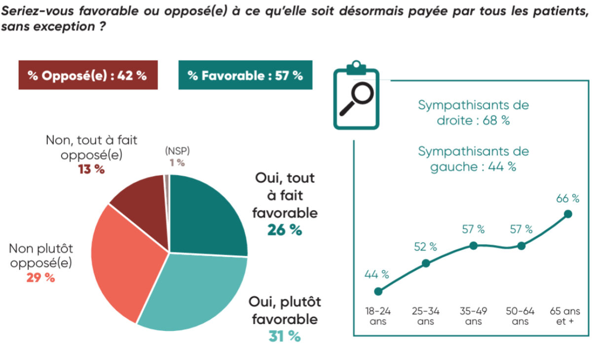 57% approuvent ainsi une extension de la franchise médicale pour les transports sanitaires afin qu’elle concerne aussi les patients qui les utilisent très régulièrement et 52% sont favorables à ce que les bénéficiaires de l’AME ou de la CSS aient désormais à avancer leurs frais de santé au lieu de bénéficier du tiers-payant