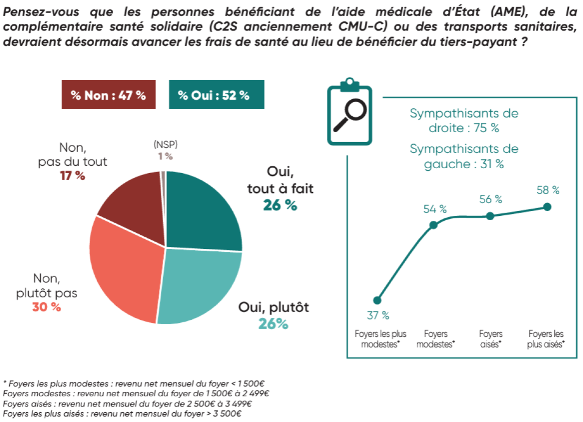 Une (courte) majorité de Français (52% vs 47%) se dit même favorable à ce que les bénéficiaires de l’AME ou de la CSS aient désormais à avancer leurs frais de santé, au lieu de bénéficier du tiers-payant. Mais cette idée divise davantage l’opinion (la gauche est contre).