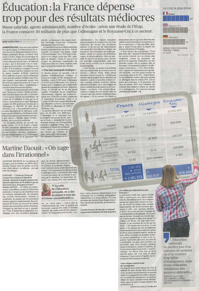 Jeudi 12 septembre, le quotidien Le Figaro, reprend l'étude de la Fondation iFRAP sur le surcoût de l'Éducation nationale en France par rapport aux coûts des systèmes allemand et britannique et ce, pour un même nombre d'élèves.