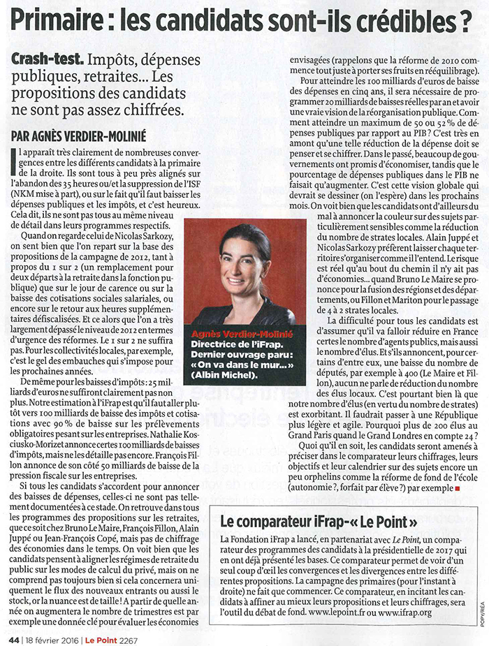 Vendredi 19 février, Agnès Verdier-Molinié, directeur de la Fondation iFRAP, signait une tribune dans les pages du Point pour faire le point sur les programmes des candidats à la présidentielle et aux primaires de Républicains (voir notre comparateur en ligne).