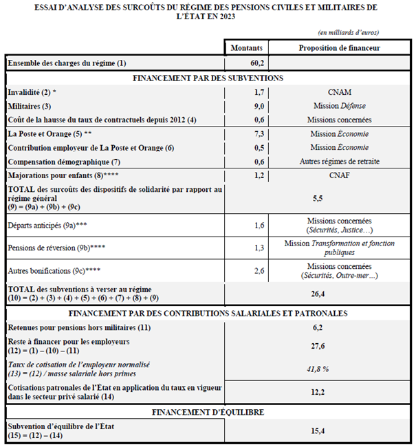 Le rapporteur général considère que le financement de ces dispositifs spécifiques, justifiés par la pénibilité et les sujétions associées à certaines missions de service public, notamment en matière de défense, devrait faire l’objet d’une subvention budgétaire clairement identifiée et imputée aux missions concernées (Défense, Économie, Sécurités…) plutôt que d’être intégré à une cotisation d’ensemble sur le salaire des fonctionnaires (proposition 3)