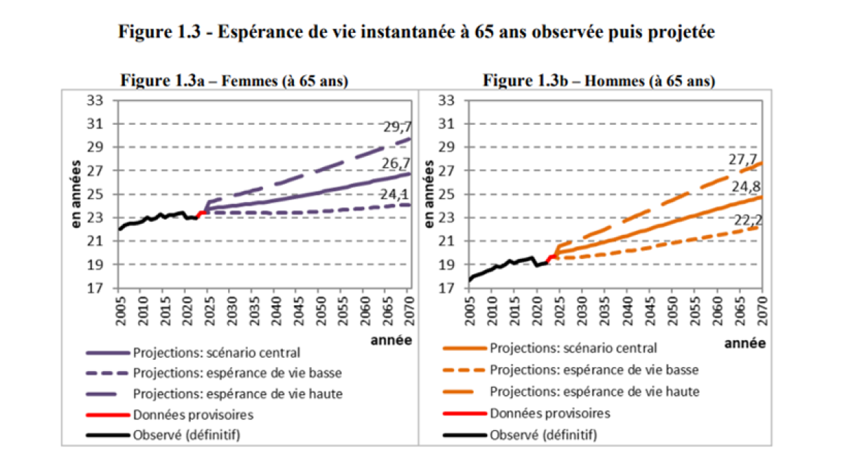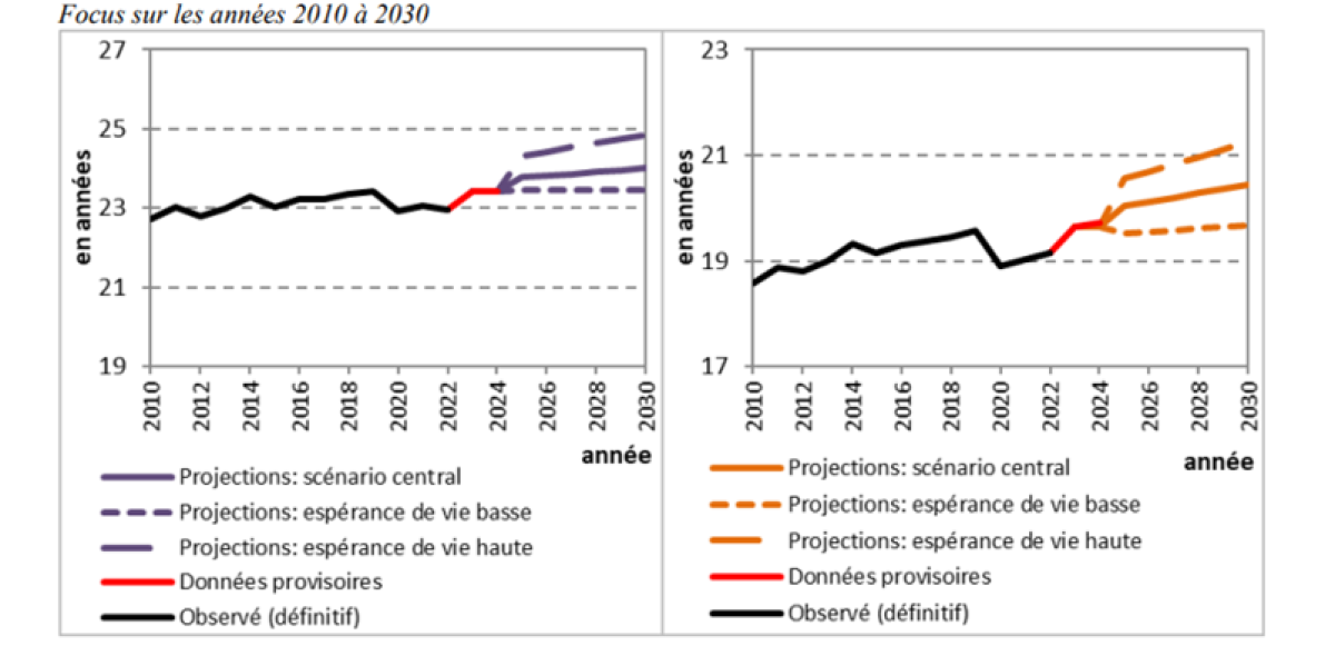 En 2070, toujours si l’on se fie au scénario central, ces projections prévoient une espérance de vie à 65 ans pour les femmes de 26,7 ans, soit 3,3 ans de plus qu’en 2024, et de 24,8 ans pour les hommes, soit 5,1 ans de plus !