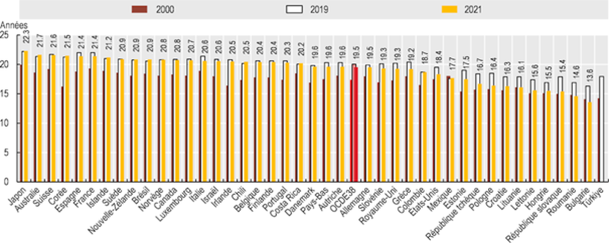 Espérance de vie à 65 ans, 2000, 2019 et 2021 (ou année la plus proche)