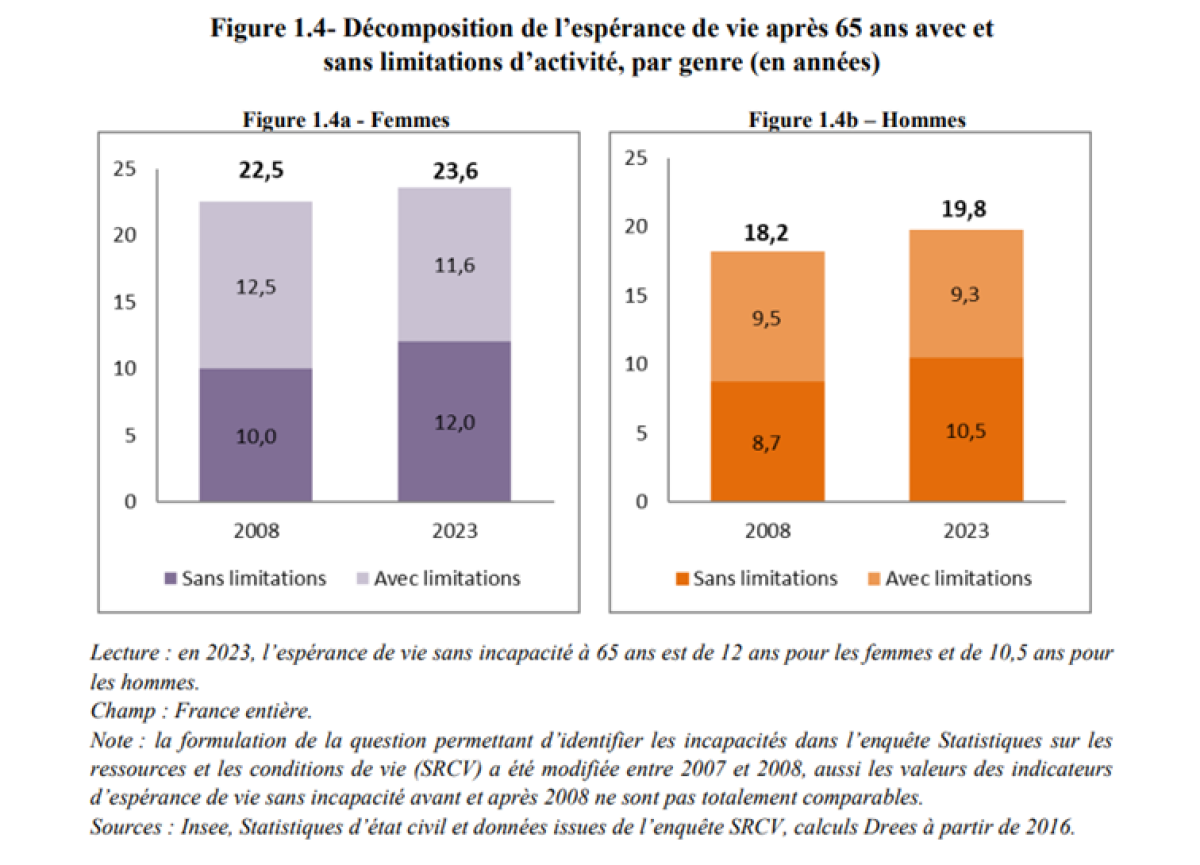 En 2023, à 65 ans, les hommes peuvent espérer vivre 10,5 ans sans incapacité et les femmes 12 ans. « L’espérance de vie sans incapacité à 65 ans progresse régulièrement depuis 2008, pour les femmes (+ 1 an et 11 mois) comme pour les hommes (+ 1 an et 10 mois). Sur cette période, l’espérance de vie sans incapacité à 65 ans a crû plus vite que l’espérance de vie »[3].