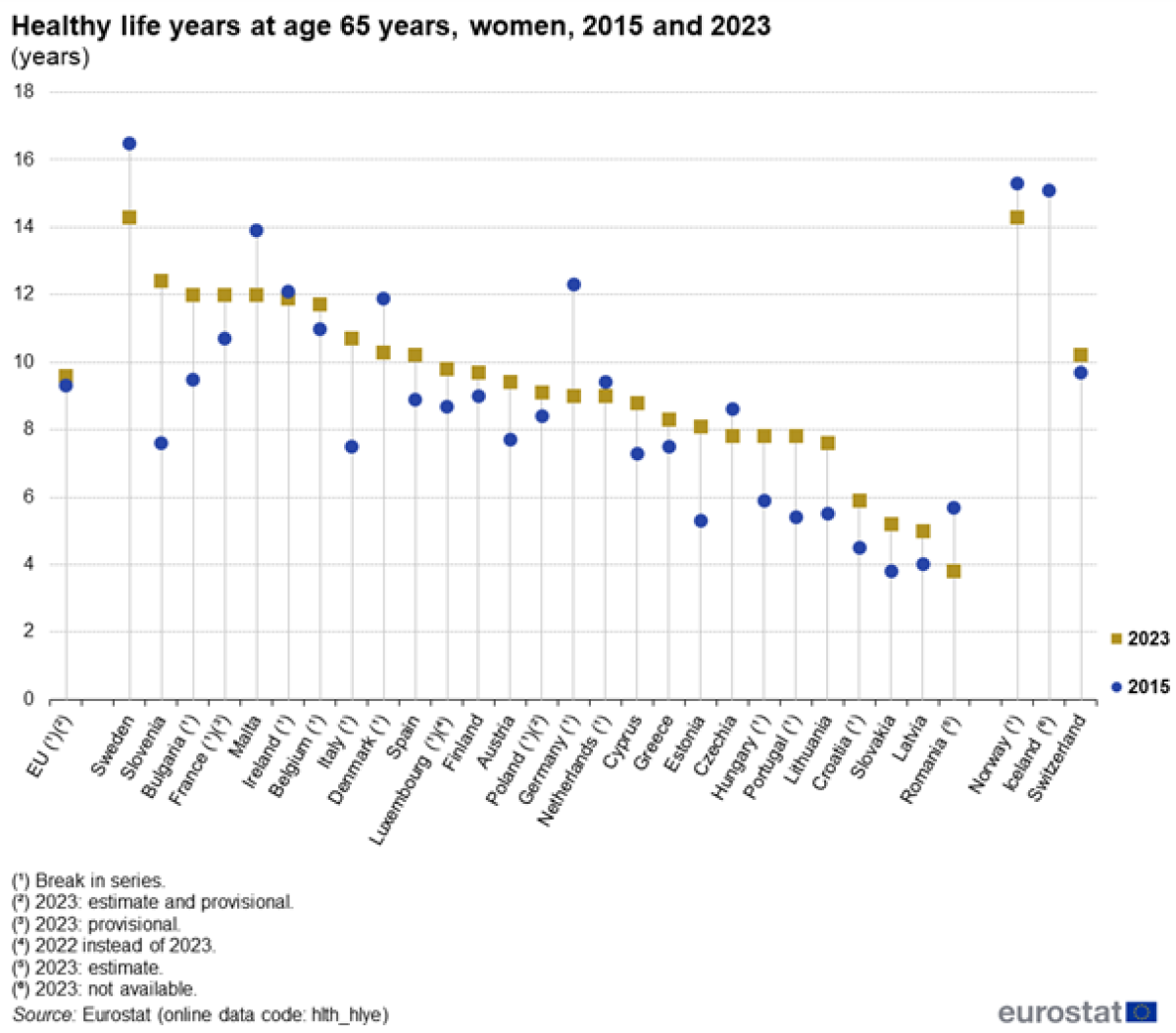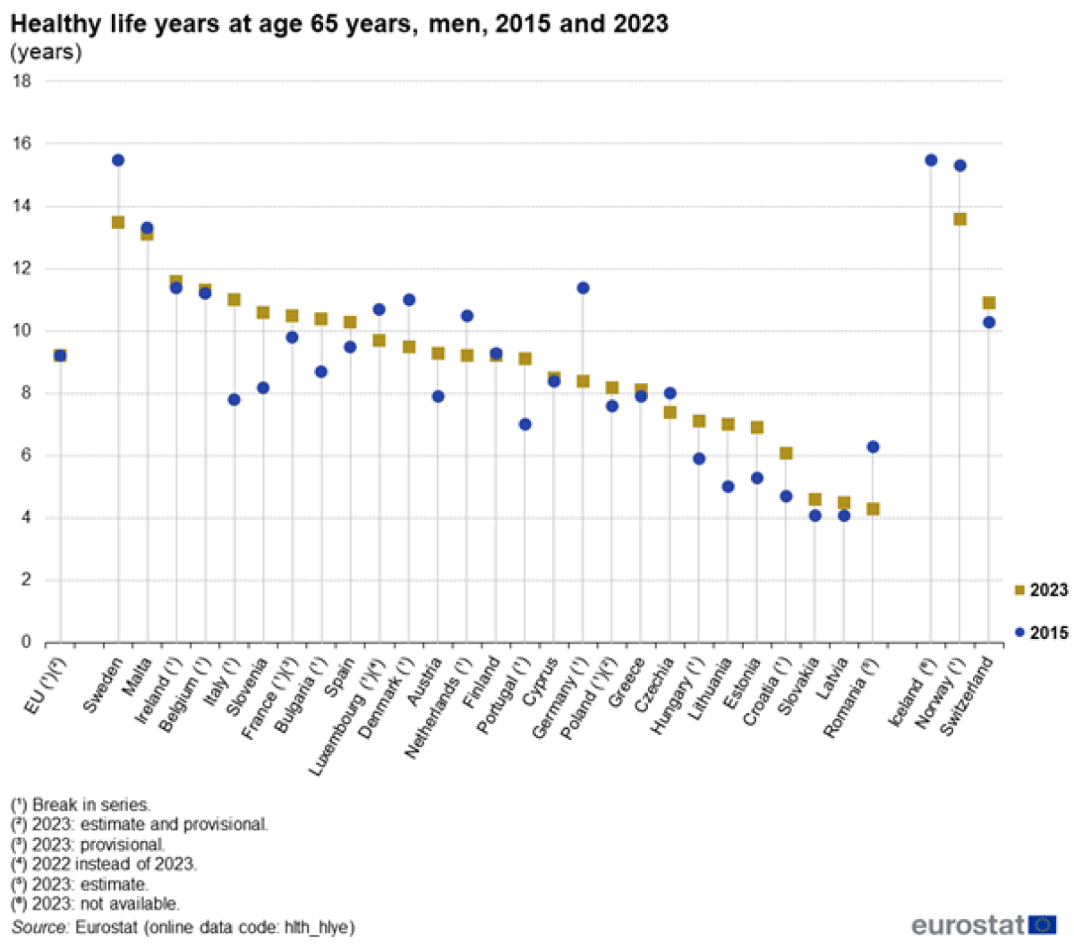 A l’échelle européenne, la France est un des pays avec la meilleure espérance de vie en bonne santé à 65 ans. Pour ce qui est des femmes, la France se situe en 2023 à la 4ème place, et à la 7ème place pour ce qui est des hommes. Et cela n’est pas nouveau. En 2010 déjà, la France se distinguait au sein des pays de l’UE en fonction de cet indicateur. L’espérance de vie à 65 ans des hommes sans limitation d’activité était alors de 8,9 ans, soit 0,5 an au-dessus de la moyenne des pays européens. Pour les femmes, cette espérance était de 9,8 ans, soit 1,2 ans de plus que la moyenne des pays européens !