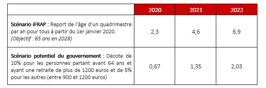 Des mesures d'urgence, mais qui rendent encore plus indispensable une réforme de fond : à savoir, un report de l'âge légal. La Fondation iFRAP a proposé dans son plan d'économies 2019 de repousser d'un quadrimestre par an l'âge légal pour atteindre 65 ans en 2028. Selon nos calculs, cette mesure pourrait représenter 18,7 milliards d'euros d'économies d'ici 2027.