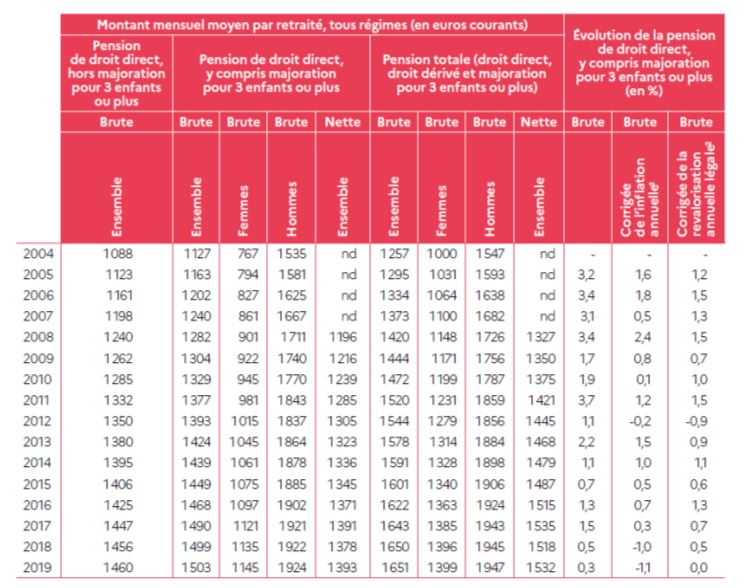 Le montant moyen de la pension de droit direct brute tous régimes (y compris la majoration de pension pour trois enfants ou plus) s’établit à 1 503 euros mensuels en décembre 2019 pour les retraités résidant en France. En tenant compte des prélèvements sociaux, la pension nette s’élève à 1 393 euros. Ce montant diminue de nouveau entre fin 2018 et fin 2019 en euros constants (-1,1 % après -1,0 %).