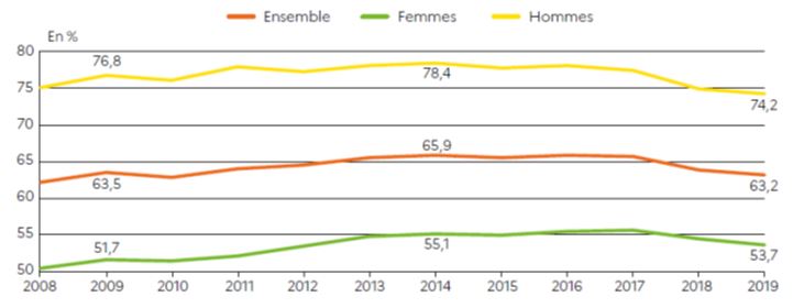 Rapport entre les effectifs de personnes en emploi et les effectifs de retraités de droit direct