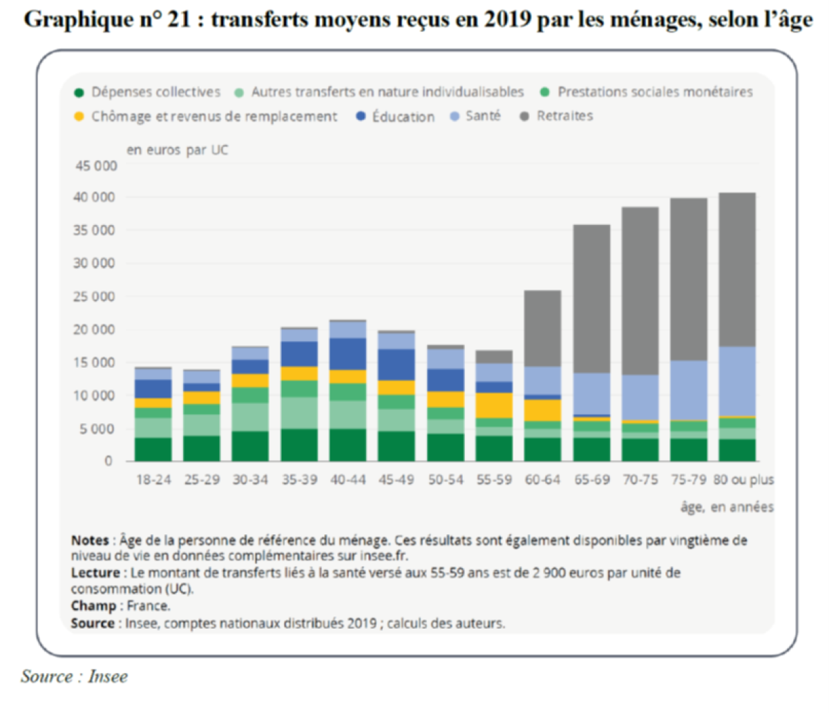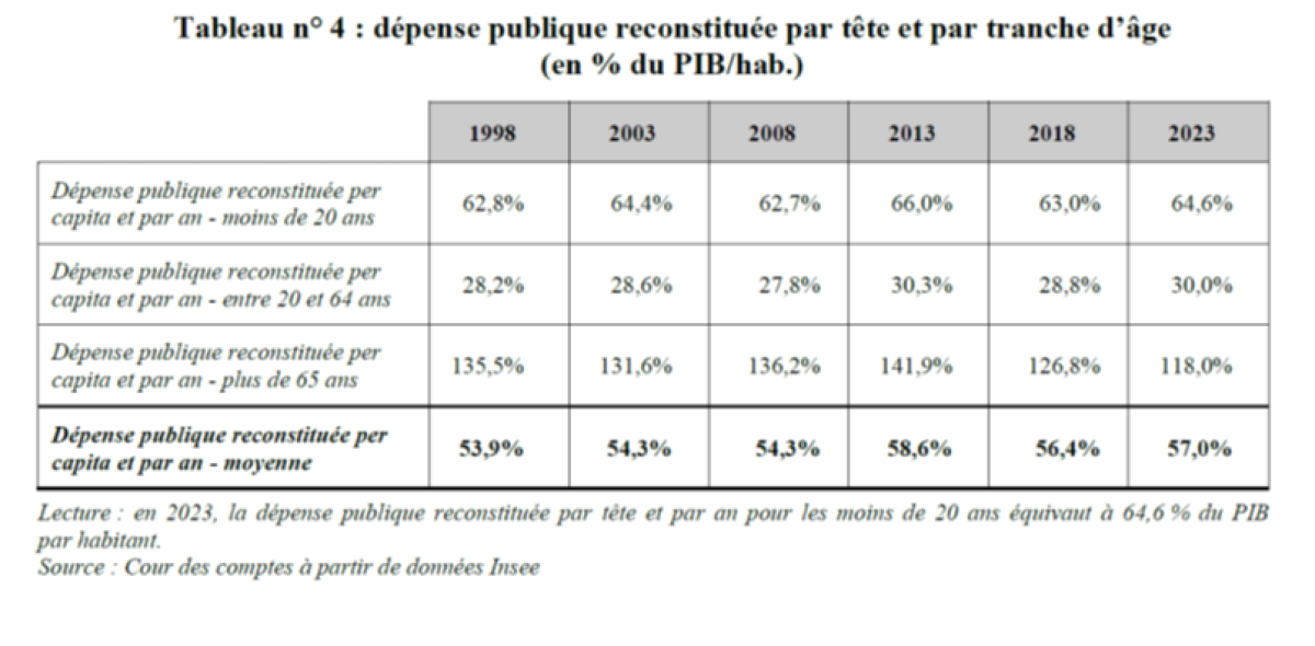 On voit qu’en 2023, la population de moins de 20 ans reçoit une part de la dépense publique légèrement supérieure à celle de la moyenne de la population, mais la population de plus de 65 ans reçoit elle le double de la moyenne, soit 118 % du PIB par habitant. La dépense publique par tête pour les plus de 65 ans est passée de 135,5 % du PIB par habitant en 1998 à 118,0% en 2023 (soit une baisse de 12,9 %). Ces chiffres montrent que l’augmentation des dépenses publiques liées au vieillissement au niveau macro ne se ressent pas au niveau individuel.
